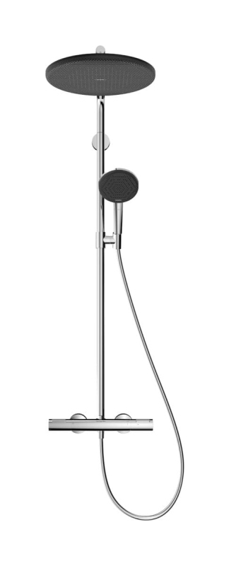 Sprchový systém s 2 funkciami, s termostatickou batériou. Rozteč batérie je 150 mm. Prietok 12 litrov/minútu.