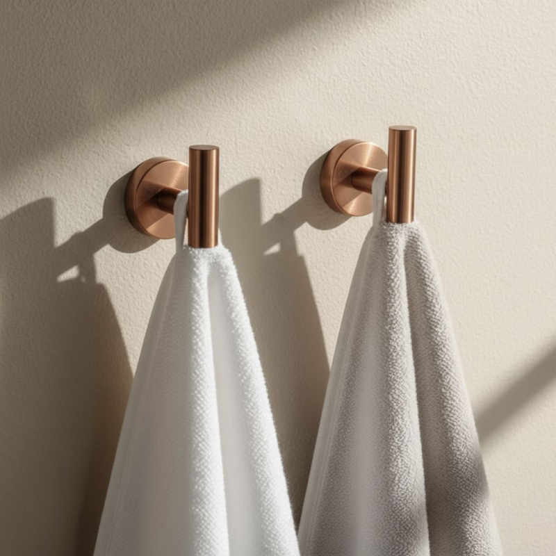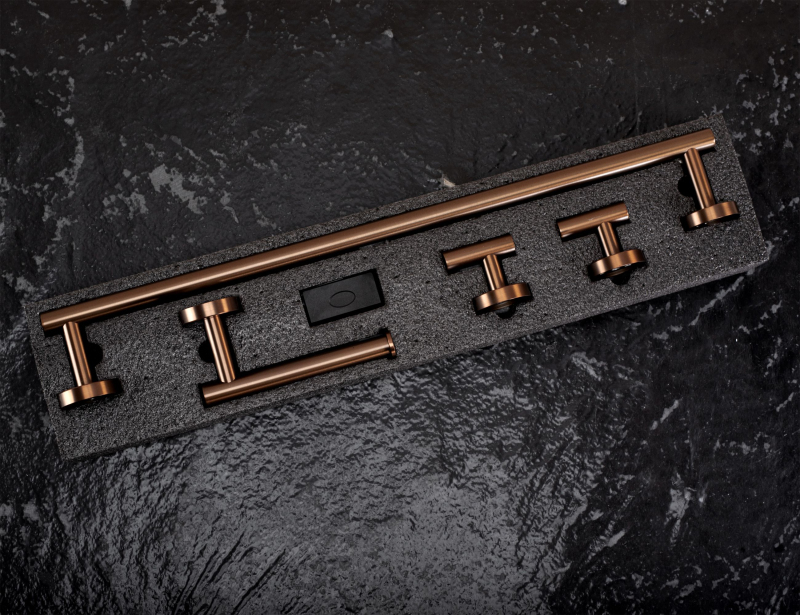 Súprava kúpeľňových doplnkov Ari je elegantné a praktické riešenie, ktoré vnesie do kúpeľne harmóniu a moderný štýl. Súčasťou sady je držiak na uteráky, držiak na toaletný papier a dva funkčné háčiky – tvoriaci jednotný a estetický komplet nevyhnutný na každodenné používanie. Všetky prvky sú vyrobené z vysoko kvalitného kovu, odolného proti vlhkosti a korózii. Povrch vo farbe kartáčovanej medi dodáva celku eleganciu a jedinečný charakter, pričom zostáva odolný proti stopám používania. Doplnky sú montované na stenu, čo zaručuje stabilitu, trvanlivosť a pohodlie pri každodennom používaní. Súprava Ari spája jednoduchosť tvaru s nadčasovou estetikou. Jej minimalistický dizajn sa skvele hodí do klasických aj moderných kúpeľní, čím vytvára jednotný, funkčný a elegantný priestor.