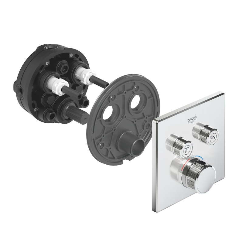 Termostatická podomietková sprchová batéria. V hranatom dizajne. V chrómovom prevedení. Batériu je možné zapojiť iba v kombinácii s podomietkovým telesom GROHE Rapido SmartBox (35600000).