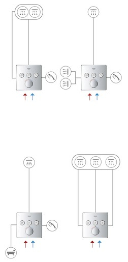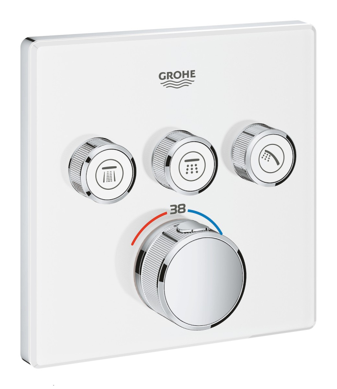 Termostatická podomietková batéria s tromi ventilmi v chrómovom prevedení. Farba mesačná biela. Technológia SmartControl vám umožní prepínať medzi požadovanými zdrojmi prúdu a regulovať objem vody a jej teplotu pomocou otočných tlačidiel. Túto batériu je možné zapojiť iba v kombinácii s podomietkovým telesom GROHE Rapido SmartBox (35600000). Technológie StarLight, FastFixation a SafeStop.