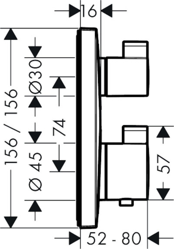 Termostatická podomítková baterie bez podomítkového tělesa. V hranatém designu. V chromovém provedení. Průtok baterie je 26 litrů/minutu.