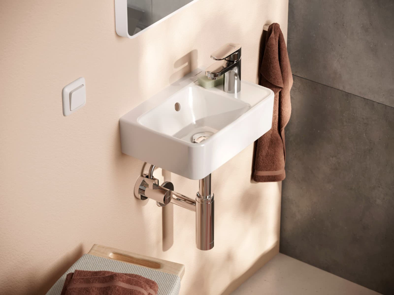 Umývadlo v bielej farbe otvor pre batériu vpravo od výrobcu Hansgrohe zo série Xanuia Q. Rozmery produktu sú 36x25x10,5 cm.