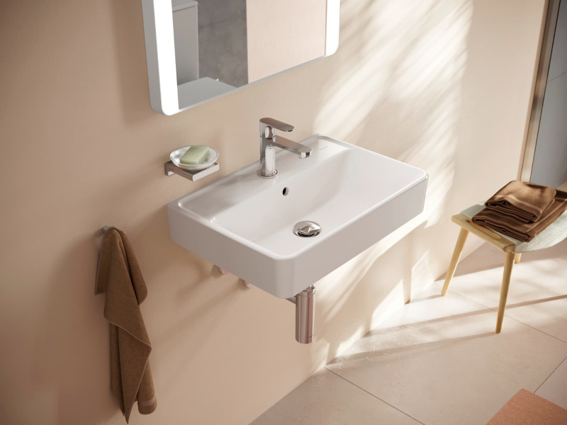 Umývadlo v bielej farbe s otvorom pre batériu uprostred od výrobcu Hansgrohe zo série Xanuia Q. Rozmery produktu sú 60x37x10,5 cm.