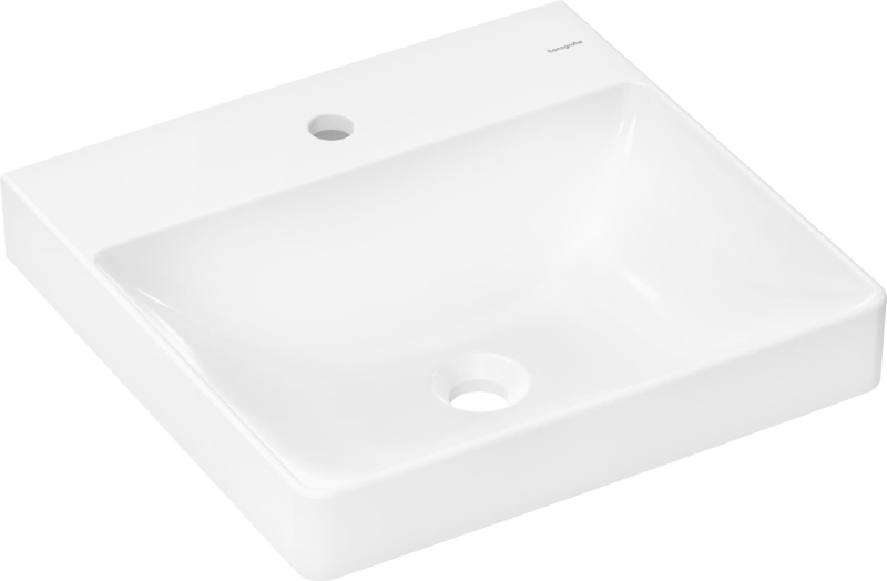 Umývadlo v bielej farbe otvor pre batériu, bez prepadu od výrobcu Hansgrohe zo série Xelu Q. Rozmery produktu sú 50x48 cm.