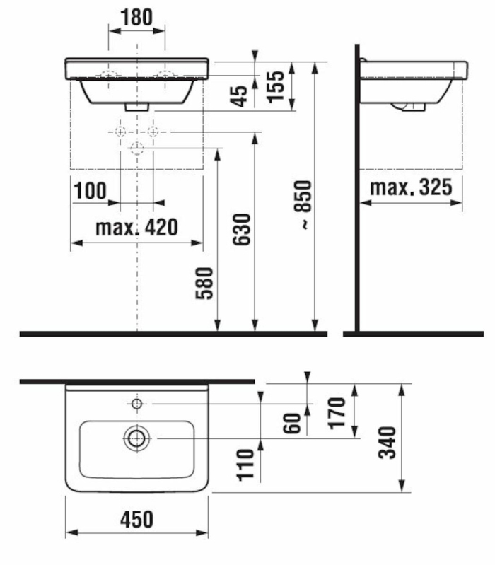Umývadlo s otvorom pre batériu uprostred so šírkou 45 cm, hĺbkou 34 cm a výškou 15,5 cm. Povrch s jednoduchou údržbou. Balenie bez sifónu a batérie. Montážnu sadu je nutné dokúpiť.