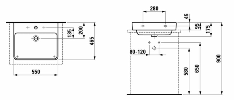 Umývadlo s otvorom pre batériu uprostred o šírke 55 cm, hĺbke 46,5 cm a výške 9,5 cm. Balenie bez sifónu a batérie. Montážnu sadu je nutné dokúpiť.