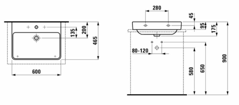 Umývadlo s otvorom pre batériu uprostred so šírkou 60 cm, hĺbkou 46,5 cm a výškou 9,5 cm. Balenie bez sifónu a batérie. Montážnu sadu je nutné dokúpiť.