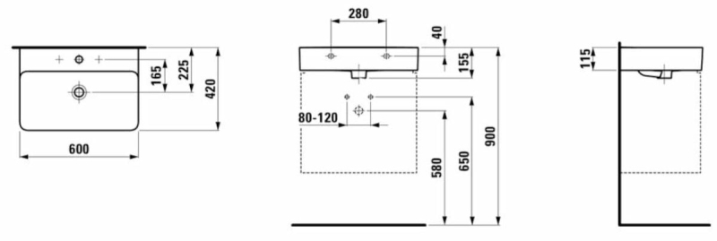 Umývadlo s otvorom pre batériu uprostred so šírkou 60 cm, hĺbkou 42 cm a výškou 15,5 cm. Balenie bez sifónu a batérie. Montážnu sadu je nutné dokúpiť.