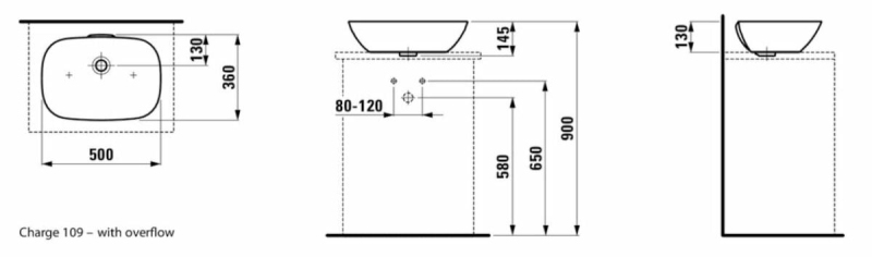 Umývadlo bez otvoru pre batériu so šírkou 50 cm, hĺbkou 36 cm a výškou 14,5 cm. Balenie bez sifónu a batérie. Montážna sada je súčasťou balenia.