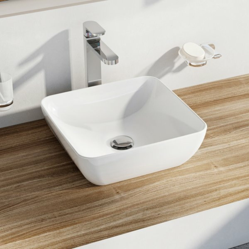 Umývadlo na dosku bez prepadu o šírke 38 cm, hĺbke 38 cm.
