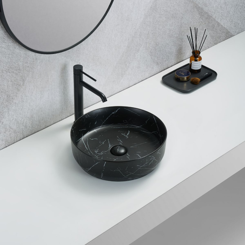 Umývadlo na dosku bez prepadu v mramorovom dizajne v čiernej farbe zo série Infinitio disponuje priemerom 39 cm a výškou 12 cm. Vtok nie je súčasťou dodania.