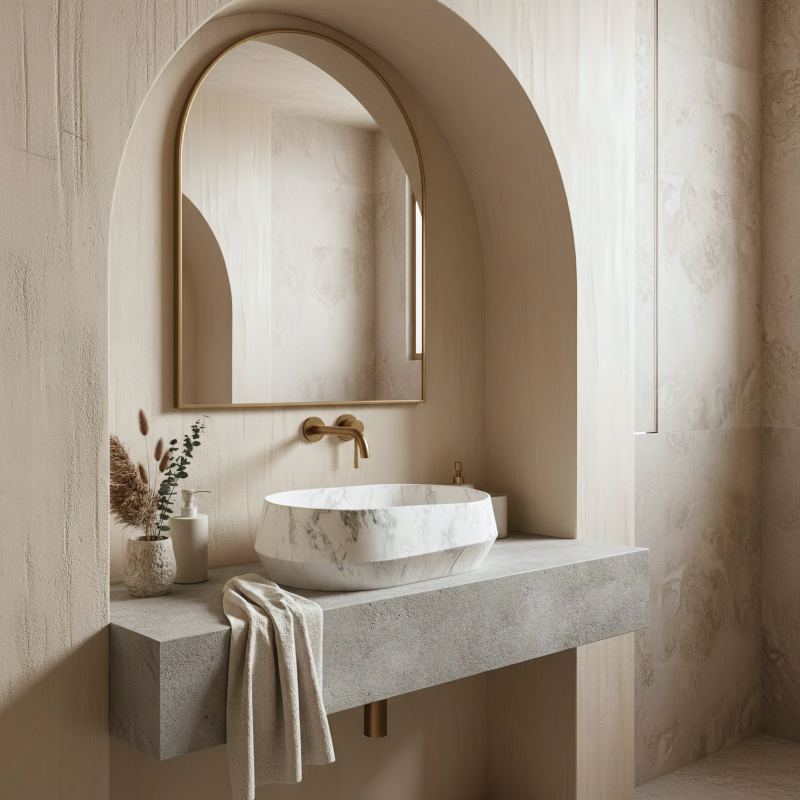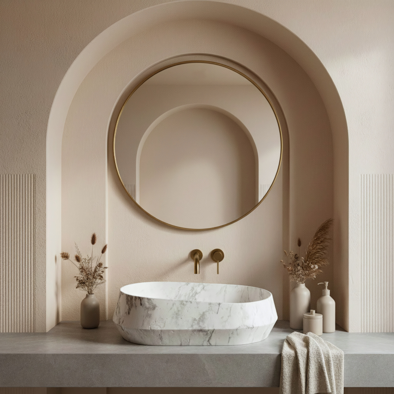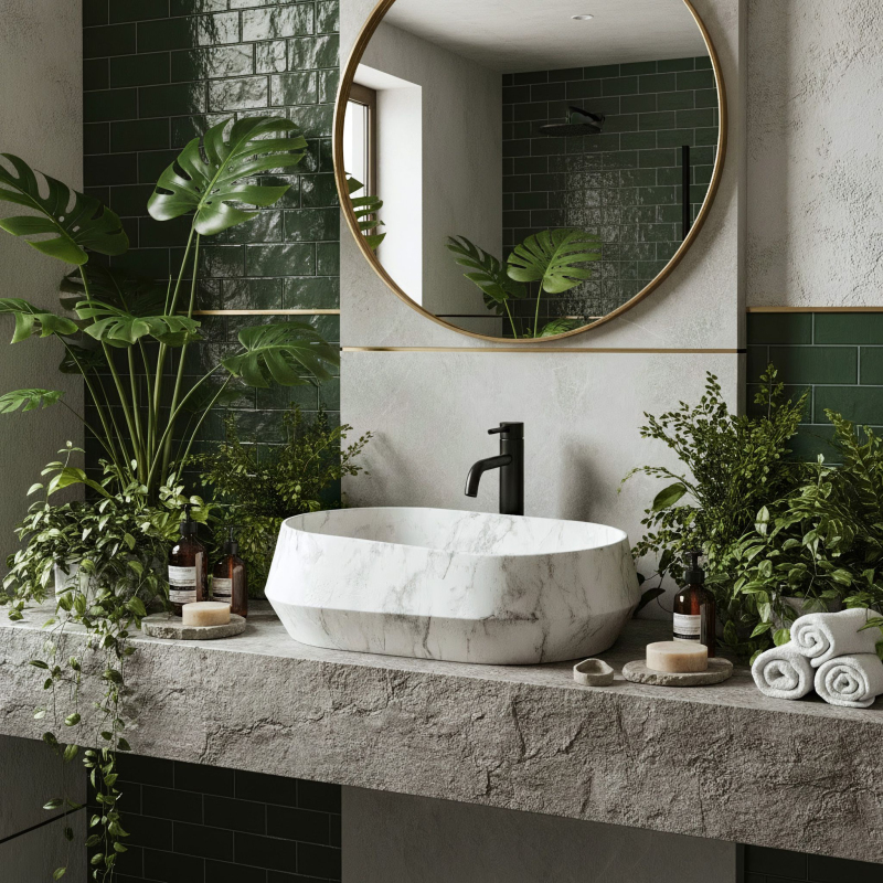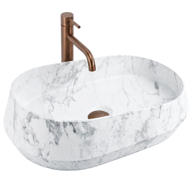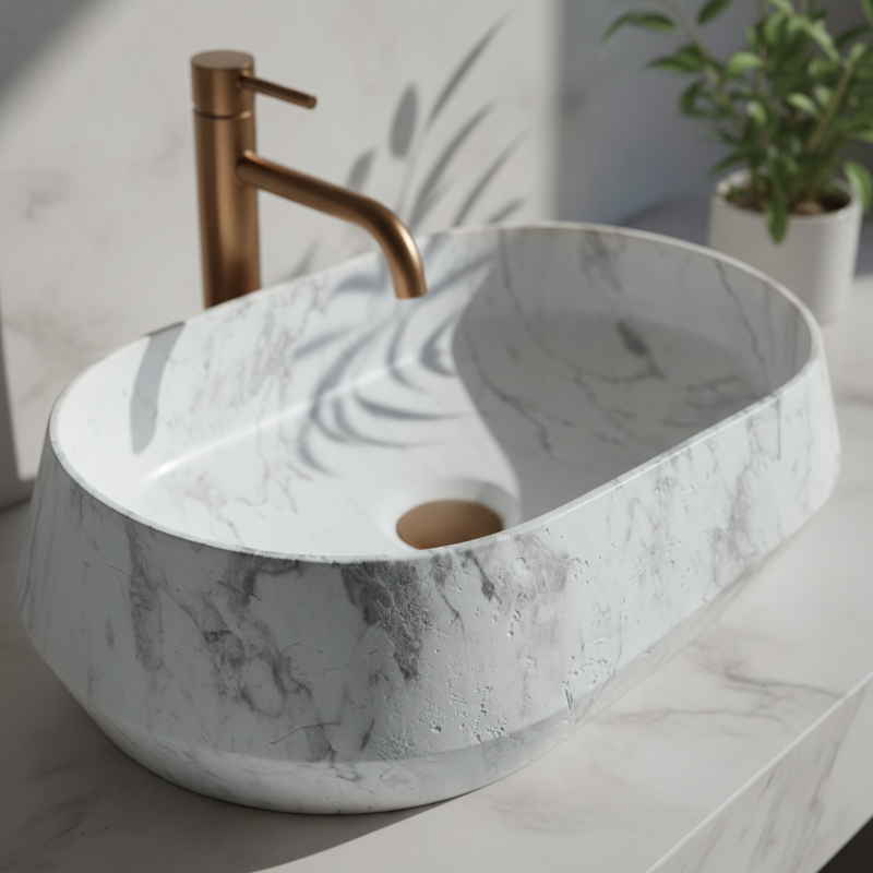 Umývadlo na dosku Zoe Dune je model, ktorý na prvý pohľad upúta pozornosť. Namiesto klasickej dokonale rovnej misy ponúka tvar inšpirovaný prírodou a surovým kameňom. Je to skvelá voľba, ak hľadáte výrazný, ale neprehnaný akcent do kúpeľne. Umelý kameň (Artificial Stone) - umývadlo je vyrobené z vysoko kvalitného kompozitu. Tento materiál sa vyznačuje masívnosťou, mimoriadnou odolnosťou a vysokou rezistenciou voči mechanickému poškodeniu. Navyše je príjemný na dotyk a dlhšie udržuje teplotu vody. Asymetrický tvar – to, čo model Zoe Dune najviac odlišuje, je jeho nepravidelná forma. Jeden okraj misy je zreteľne vyšší ako druhý. Tento dizajnový prvok dodáva umývadlu dynamický, organický vzhľad. Vzor prírodného kameňa – povrch má matnú úpravu s výrazným šedo-grafitovým žilkovaním. Matná textúra umocňuje surový efekt prírodného materiálu a zároveň je veľmi praktická pri každodennom používaní. Montáž na dosku - umývadlo je určené na inštaláciu priamo na skrinku alebo dosku. Tento spôsob montáže umožňuje plne vyniknúť jeho netradičnému tvaru a uľahčuje usporiadanie priestoru okolo. Pohodlné vnútro – napriek nepravidelnému vonkajšiemu tvaru je vnútro misy hladké a správne tvarované. Voda voľne steká do odpadu, čo obmedzuje rozstrekovanie pri umývaní rúk. Umývadlo Zoe Dune predstavuje výrazný prírodný akcent v interiéri. Jeho asymetrická línia a kamenná štruktúra sa ideálne hodí do moderných, minimalistických kúpeľní aj interiérov v štýle wabi-sabi.