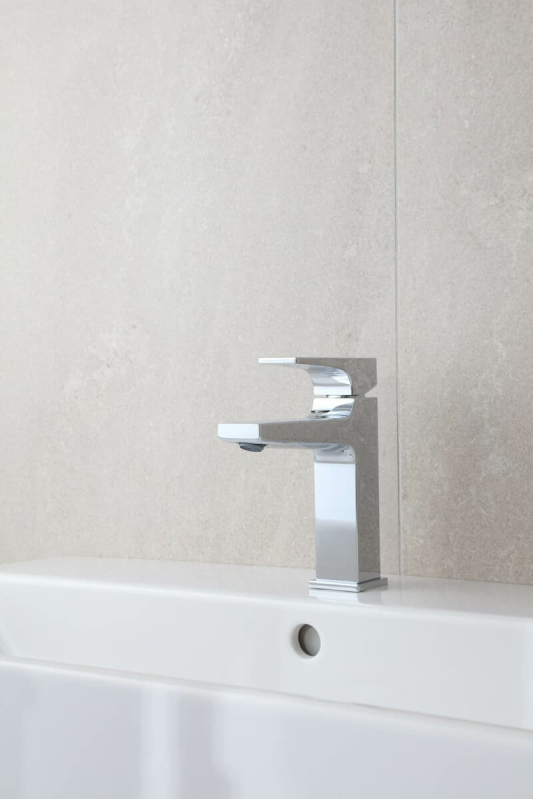 Páková stojanková umývadlová batéria s clic-clacom. V hranatom dizajne. V chrómovom prevedení. Prietok batérie je 5 litrov/minútu. Výška batérie je 18,4 cm. Ramienko je vo výške 11,7 cm.