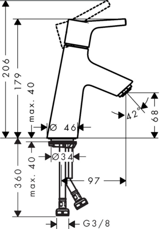 Páková stojanková umývadlová batéria bez výpustu. V chrómovom prevedení. Prietok batérie je 5 litrov/minútu. Výška batérie je 17,9 cm. Ramienko je vo výške 6,8 cm.