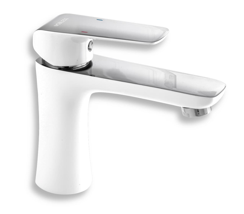 Páková stojanková umývadlová batéria bez výpustu. V prevedení biela a chróm. Výška batérie je 15 cm.