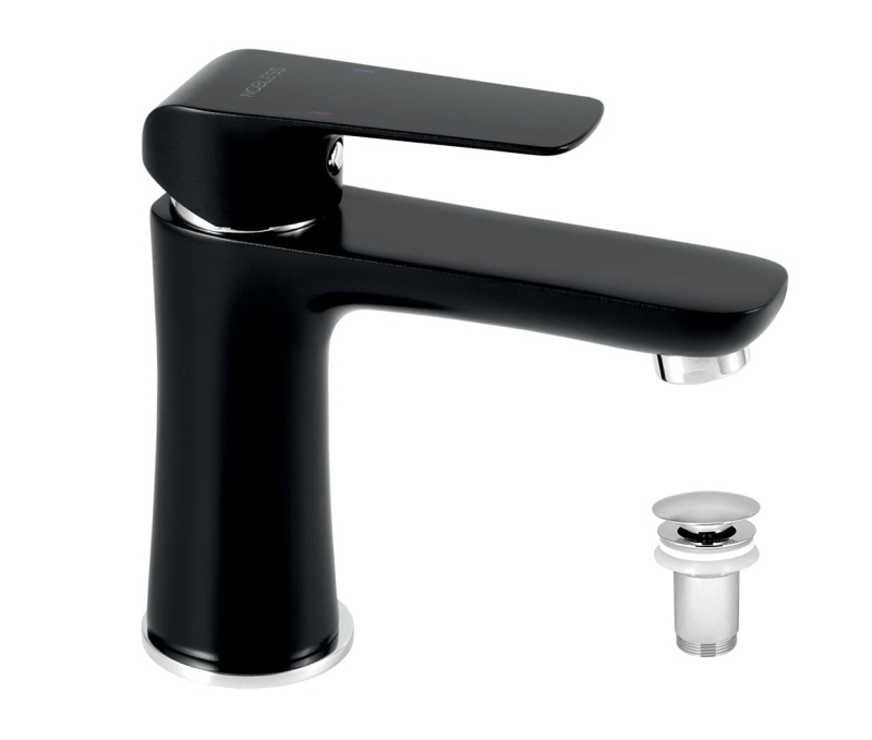 Páková stojanková umývadlová batéria s click-clack výpustom. V prevedení čierna a chróm.