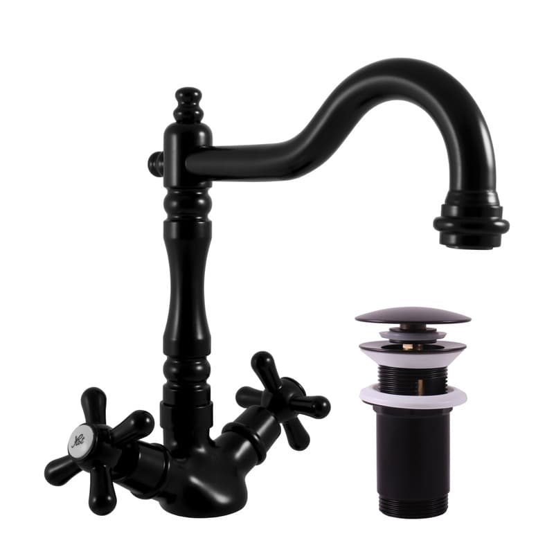 Kohútiková stojanková UMÝVADLOVÁ BATÉRIA s clic-clacom. V čiernej farbe. Výška batérie je 22,4 cm. S matným povrchom. Pripojenie flexi hadičiek G 1/2"