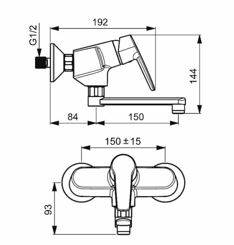 Páková nástěnná umyvadlová baterie s otočným ramínkem. V chromovém provedení. Průtok baterie je 13,2 litrů/minutu. Rozteč baterie 150 mm.