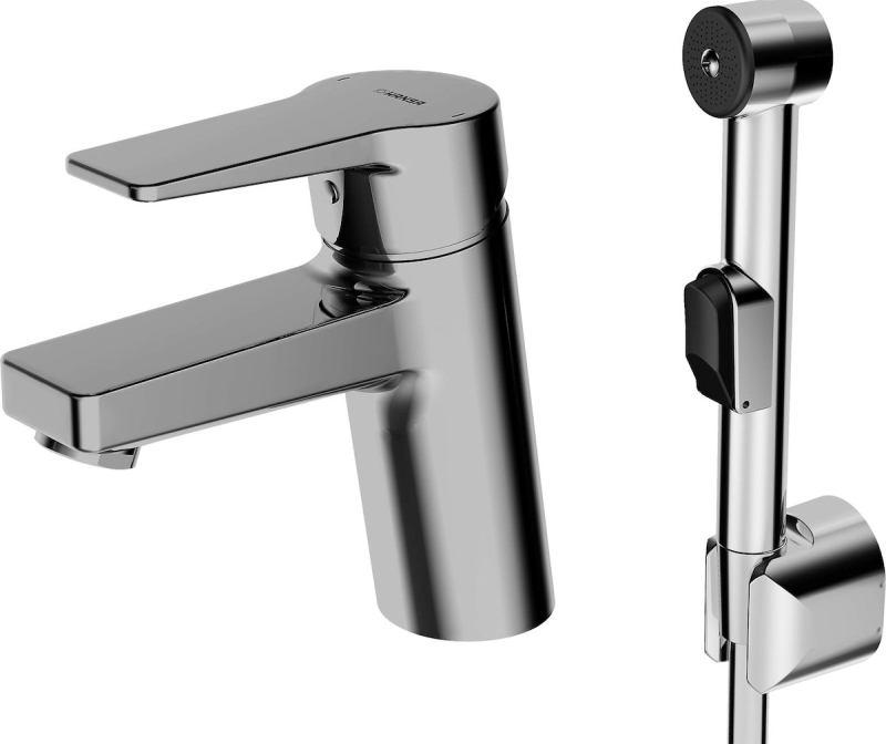 Páková stojánková umyvadlová baterie s bidetovou sprškou. V chromovém provedení. Průtok baterie je 6 litrů/minutu. Výška baterie je 14,3 cm. Ramínko je ve výšce 7,6 cm.