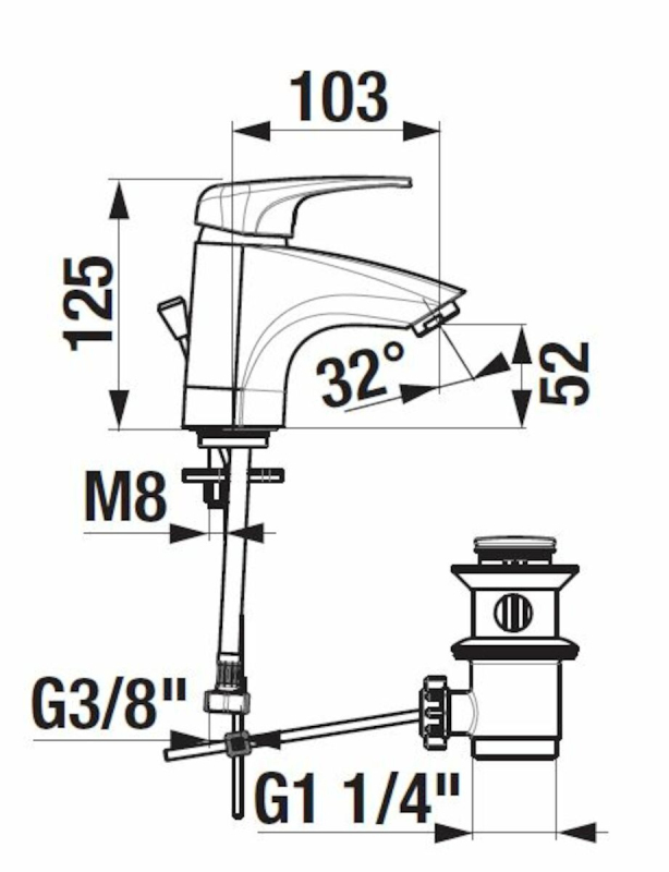 Páková stojánková umyvadlová baterie s výpustí. V oblém designu. V chromovém provedení. Průtok baterie je 5,7 litrů/minutu. Výška baterie je 12,5 cm. Ramínko je ve výšce 5,2 cm.