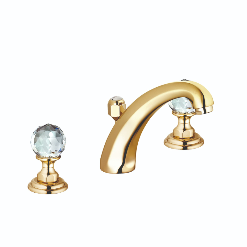Kohoutková stojánková umyvadlová baterie s výpustí. V imitaci zlaté barvy. Průtok baterie je 12,2 litrů/minutu.