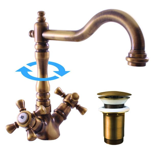 Kohoutková stojánková UMYVADLOVÁ BATERIE s clic-clacem. V provedení stará mosaz. Výška baterie je 22,4 cm. Připojení flexi hadiček G 1/2"