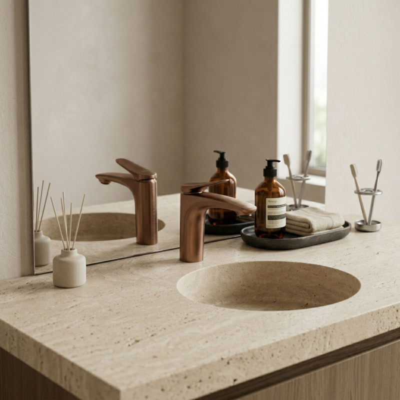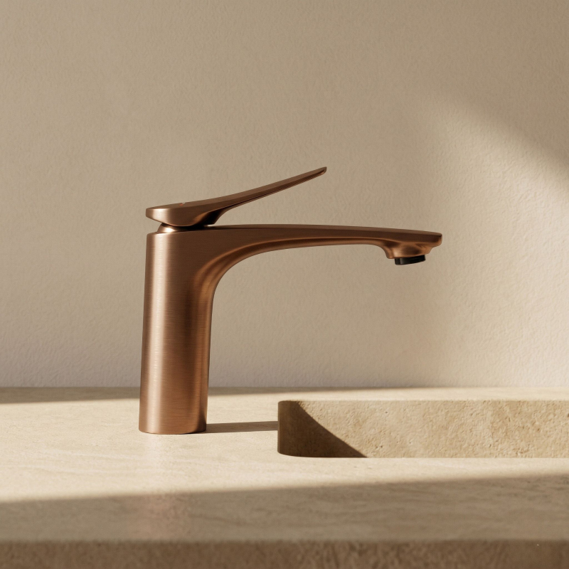 Umyvadlová baterie VISION premium v barvě broušené mědi je skvělou volbou pro ty, kteří hledají neotřelá řešení a eleganci v koupelně. Její propracovaná linie a jedinečné matné provedení zajišťují, že se tato armatura stává výrazným akcentem jak v syrových industriálních interiérech, tak v útulných moderních aranžmá. Povrchová úprava Broušená měď – hluboký, teplý odstín mědi s jemnou broušenou strukturou je detailem, který dodává interiéru prestižní charakter. Tento povrch je navíc mimořádně praktický – účinně maskuje stopy po vodě i otisky prstů a usnadňuje tak udržování baterie v čistotě. Masivní mosazné tělo – zhotovení z kvalitní mosazi zaručuje výjimečnou odolnost, stabilitu a plnou ochranu proti korozi. Keramická kartuše – použití spolehlivé keramické kartuše zajišťuje plynulou a přesnou regulaci proudu i teploty vody po mnoho let používání. Prémiová linie – pečlivě navržený tvar a důraz na detaily podtrhují vysokou kvalitu zpracování a dodávají umyvadlové zóně ucelený a elegantní vzhled. Univerzální konstrukce – ergonomické rozměry umožňují montáž na většinu umyvadel zapuštěných do desky i na modely na desku vybavené vyhrazeným otvorem pro armaturu. Volbou umyvadlové baterie VISION premium v barvě broušené mědi získáváte originální design a osvědčenou funkčnost. Jde o odolný a efektní prvek vybavení, který dodá vaší koupelně osobitý styl.