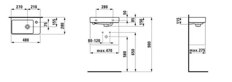 Umývátko s otvorem pro baterii vpravo o šířce 48 cm, hloubce 28 cm a výšce 15 cm. Balení bez sifonu a baterie. Montážní sadu je nutné dokoupit.