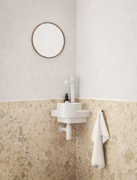 Keramické rohové umývátko Yard 280 C charakteristické svým kruhovým tvarem a zapuštěnou odkládací plochou. Kruhové umývátko do rohu doplňuje designový prvek v podobě upevňovací konzole v bílém provedení. Kouzlo elegance přináší sladění konzole, baterie, sifonu a pilety do jednoho tónu.
