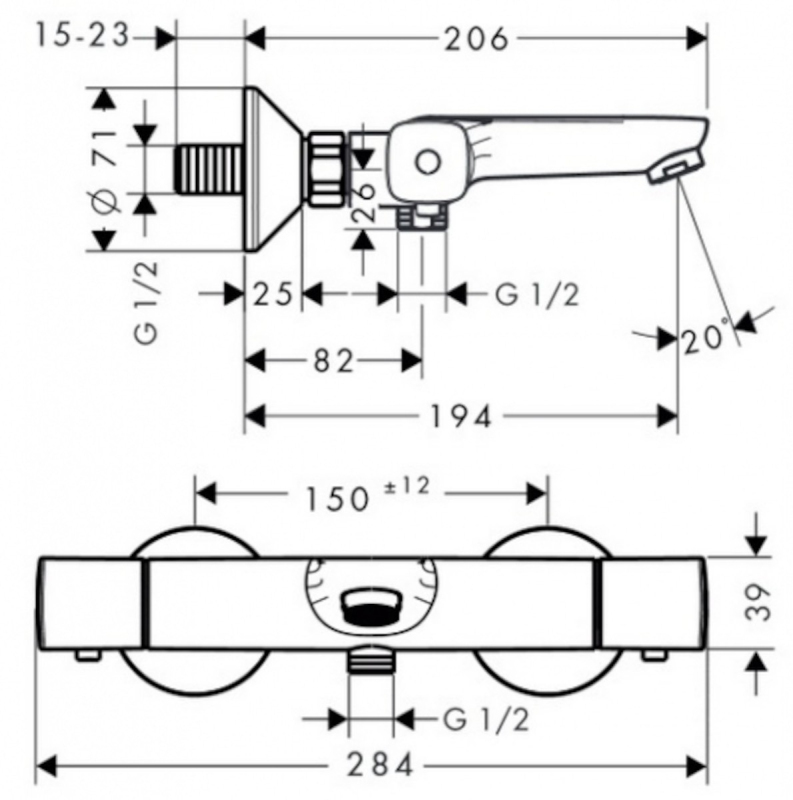 Termostatická nástenná vaňová batéria bez sprchového setu. V oblom dizajne. V chrómovom prevedení. Prietok batérie je 20 litrov/minútu. Rozteč batérie 150 mm.