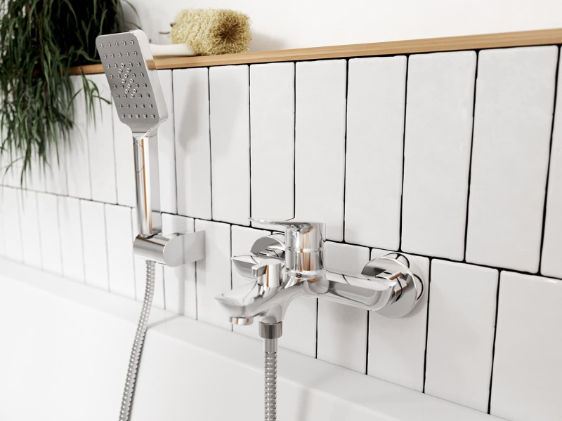 Páková nástenná vaňová batéria s vaňovým setom v chrómovom prevedení. Prietok batérie je 8 litrov/minútu. Rozteč batérie 150 mm. Vo farebnom prevedení lesk.