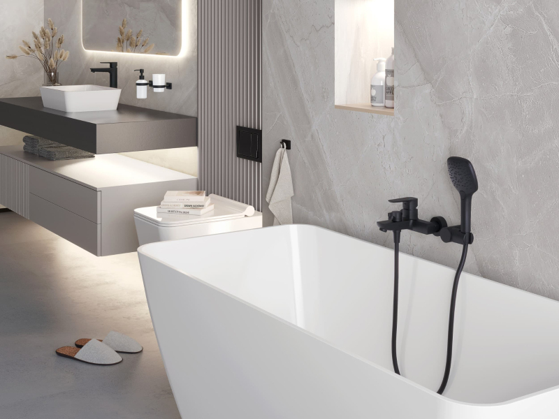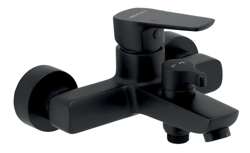 Páková nástenná vaňová batéria bez sprchového setu. V čiernej farbe. Rozteč batérie 150 mm. S matným povrchom.