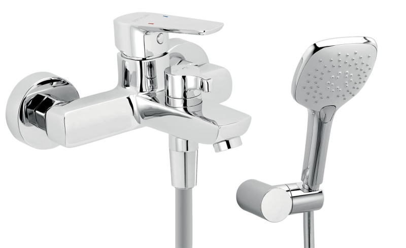 Páková nástenná vaňová batéria so sprchovacím setom v chrómovom prevedení. Rozteč batérie 150 mm. Vo farebnom prevedení lesk.