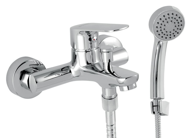 Páková nástenná vaňová batéria so sprchovacím setom v chrómovom prevedení. Rozteč batérie 150 mm. Vo farebnom prevedení lesk.