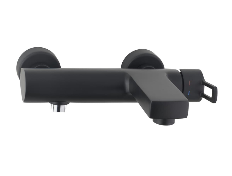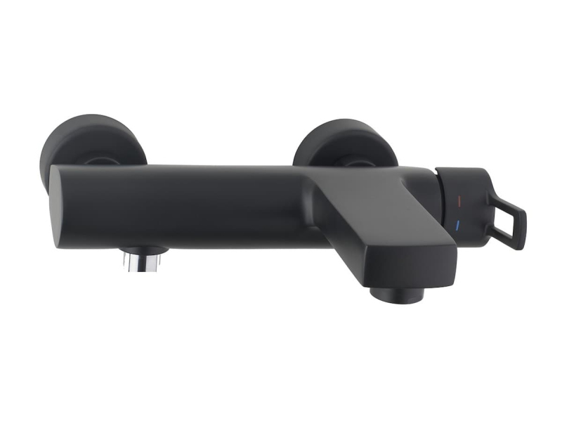 Páková nástenná vaňová batéria bez sprchového setu. V hranatom dizajne. V čiernej farbe. Rozteč batérie 150 mm. S matným povrchom.