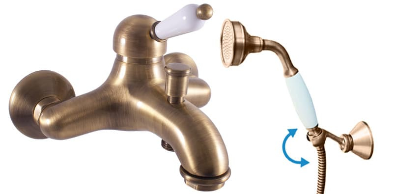 Páková nástenná VANOVÁ BATÉRIA so sprchovacím setom. V prevedení stará mosadz. Rozteč batérie 150 mm.