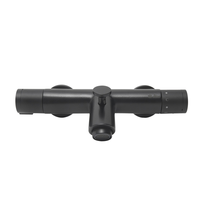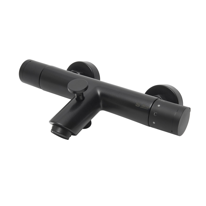 Termostatická nástenná vaňová batéria bez sprchového setu. V čiernej farbe. Rozteč batérie 150 mm. S matným povrchom.