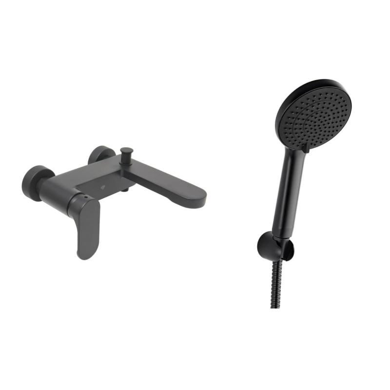Páková nástenná vaňová batéria s vaňovým setom vo farbe čierna matná. Rozteč batérie 150 mm. S matným povrchom.