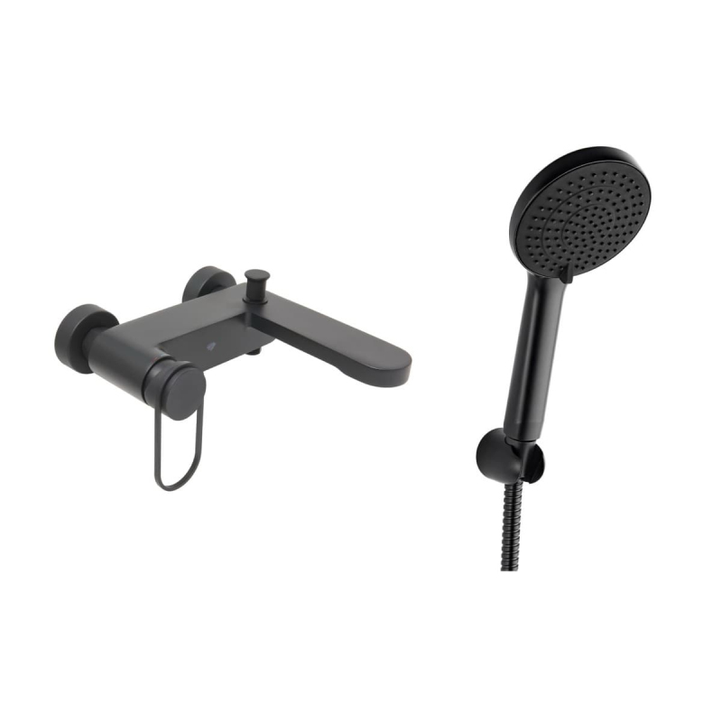 Páková nástenná vaňová batéria s vaňovým setom vo farbe čierna matná. Rozteč batérie 150 mm. S matným povrchom.