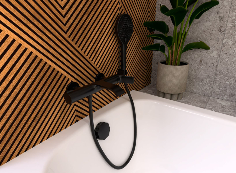 Páková nástenná vaňová batéria bez sprchového setu vo farbe čierna matná. Rozteč batérie 150 mm. S matným povrchom