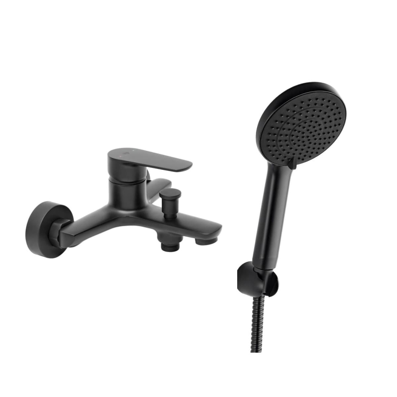 Páková nástenná vaňová batéria s vaňovým setom vo farbe čierna matná. Rozteč batérie 150 mm. S matným povrchom.
