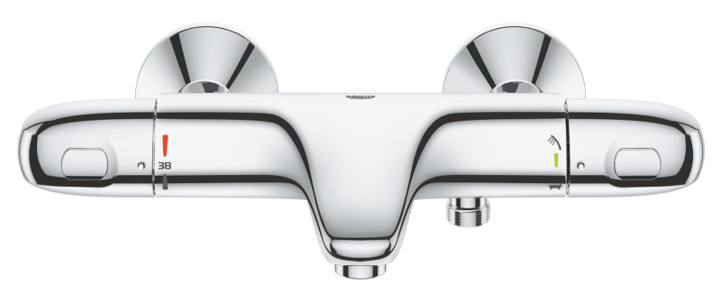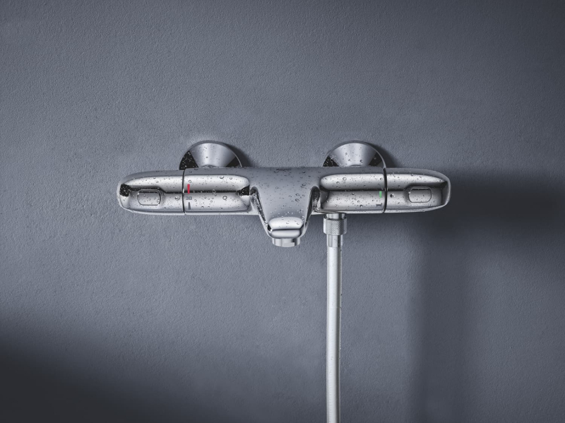 Termostatická nástěnná vanová baterie bez sprchového setu. V chromovém provedení. Rozteč baterie 150 mm.