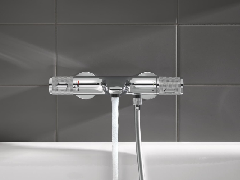 Termostatická nástěnná vanová baterie bez sprchového setu. V chromovém provedení. Rozteč baterie 150 mm.