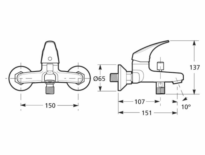 Páková nástěnná vanová baterie bez sprchového setu. V chromovém provedení. Rozteč baterie 150 mm. Výška baterie je 13,7 cm.