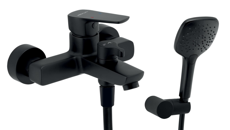 Páková nástěnná vanová baterie se sprchovým setem v černé barvě. Rozteč baterie 150 mm. S matným povrchem.