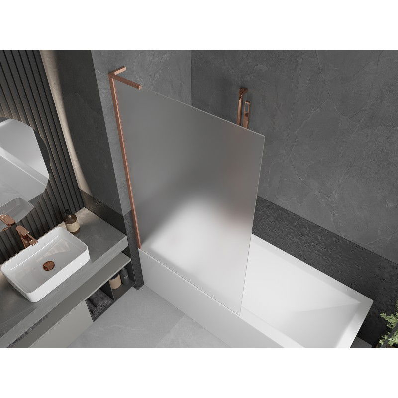 Technické údaje: Šírka: 100 cm Výška: 150 cm Typ: 1-krídlové Montáž: Univerzálny Typ: Pevné Typ skla: Tvrdené Farba skla: Mliečne Hrúbka skla: 6 mm Povrchová úprava: Kartáčovaná meď Uhlový stabilizátor L: Nerezová oceľ Povrchová úprava
