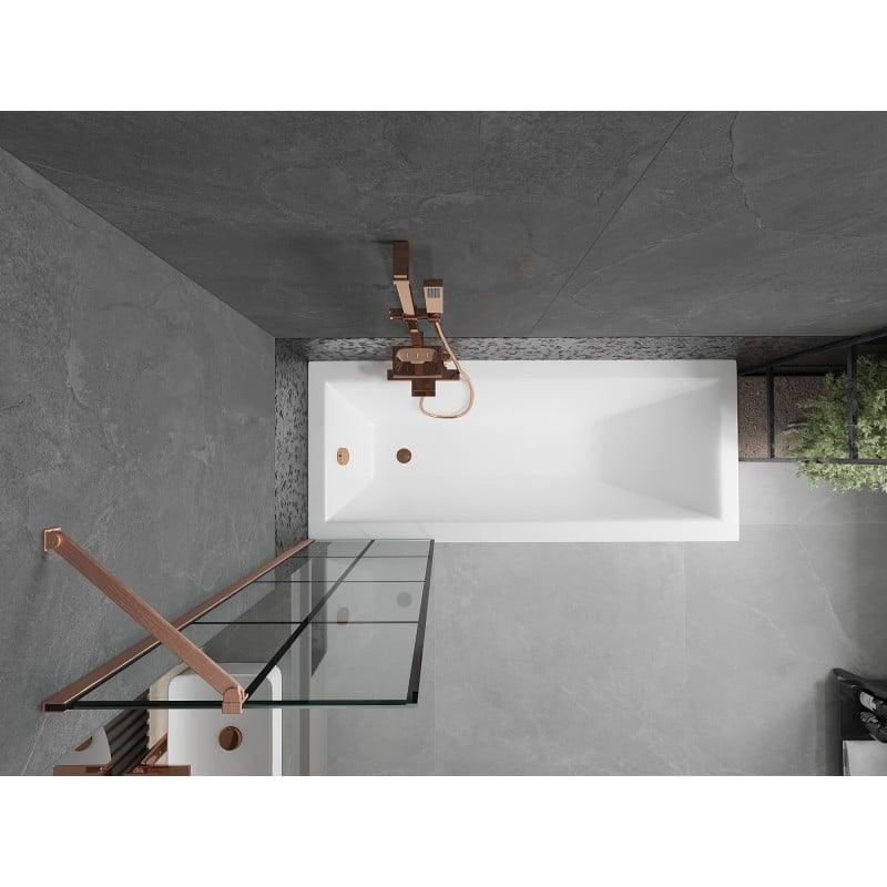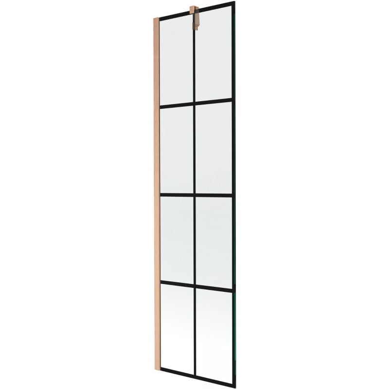 Technické údaje: Šířka: 50 cm Výška: 150 cm Typ: 1-křídlé Montáž: Univerzální Typ: Pevné Typ skla: Tvrzené Barva skla: Černá mřížka Tloušťka skla: 6 mm Povrchová úprava: Kartáčovaná měď Povlak pro snadné čištění Vyrovnání nerovností stěn