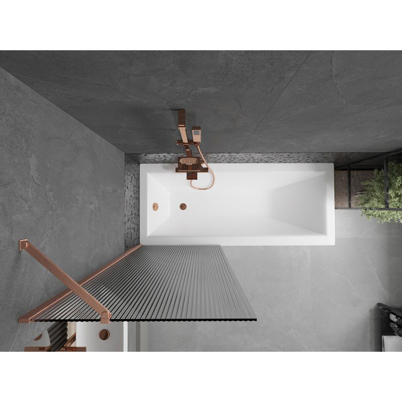Technické údaje: Šířka: 70 cm Výška: 150 cm Typ: 1-křídlé Montáž: Univerzální Typ: Pevné Typ skla: Tvrzené Barva skla: Pruhy Tloušťka skla: 6 mm Povrchová úprava: Kartáčovaná měď Povlak pro snadné čištění Vyrovnání nerovností stěn