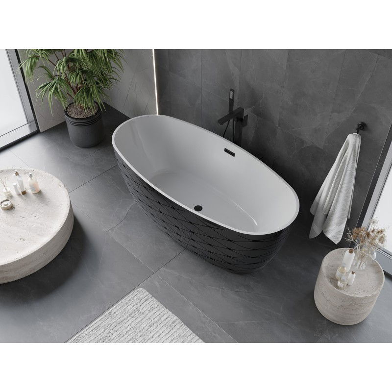 Špecifikácia produktu: Rozmery: 170 x 80 cm Výška: 59 cm Hĺbka: 45 cm Inštalácia: Voľne stojaci Materiál: Sanitárny akrylát Farba: Biela / Čierna Povrchová úprava: Čierna Štruktúra: Vzor Otvor pre prepad: Áno Otvor pre batériu: Nie Sifón a zátka click-cla UV žiarenie