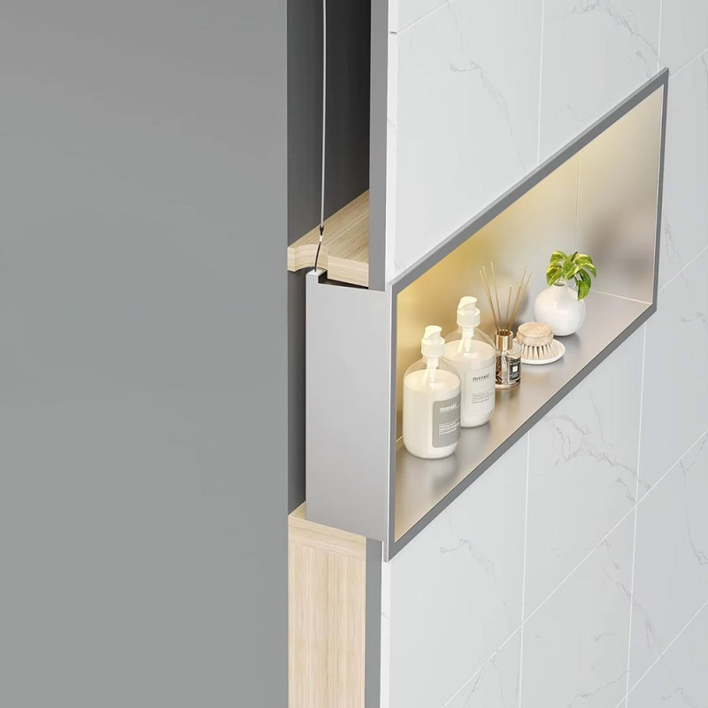 Vstavaná kúpeľňová polica s LED osvetlením je funkčné a estetické riešenie, ktoré sa skvele hodí do sprchy, nad vaňu alebo do inej časti kúpeľne. Vyrobená z vysoko kvalitnej nerezovej ocele Aisi 304, je odolná voči vlhkosti, korózii a intenzívnemu používaniu, a tak si zachová svoj vzhľad po mnoho rokov. Integrovaný Led opasok s výkonom 12 W a farbou svetla 3000K vyžaruje teplé, príjemné svetlo, ktoré dodáva interiéru atmosféru a zároveň zvyšuje pohodlie každodenného používania. Vstavaná montáž vytvára minimalistický a moderný efekt a polica poskytuje pohodlné miesto na uloženie kozmetiky a kúpeľňových doplnkov. Ide o praktický prvok kúpeľňového vybavenia, ktorý spája moderný dizajn, odolnosť a dodatočné osvetlenie, ktoré podčiarkuje eleganciu aranžmánov.